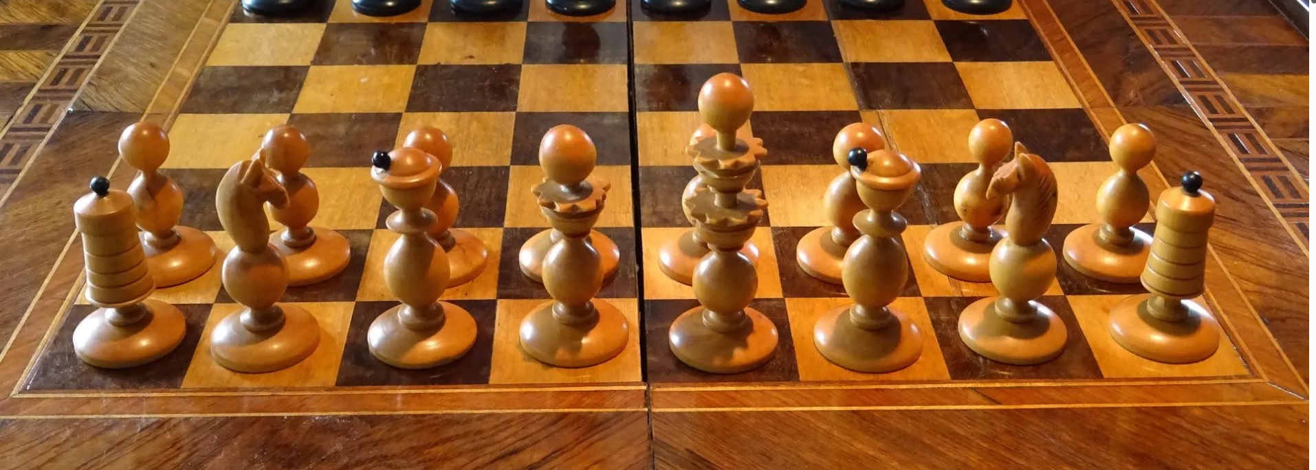Biedermeier chessmen, named for the 19th-century Central European design movement, are celebrated for their elegant silhouettes and whimsical details. A defining feature of these sets is the imaginative design of the Läufer (runner) chess piece, which often feature finials in opposite-colored spheres or batons to evoke a “feather in a cap.” Over time, these evolved into more literal depictions of period headwear, such as jaunty berets, top hats, or bowlers, reflecting the artistic character of the era. This set is documented in the historical collection of Holger Langer (chess-collection.de).