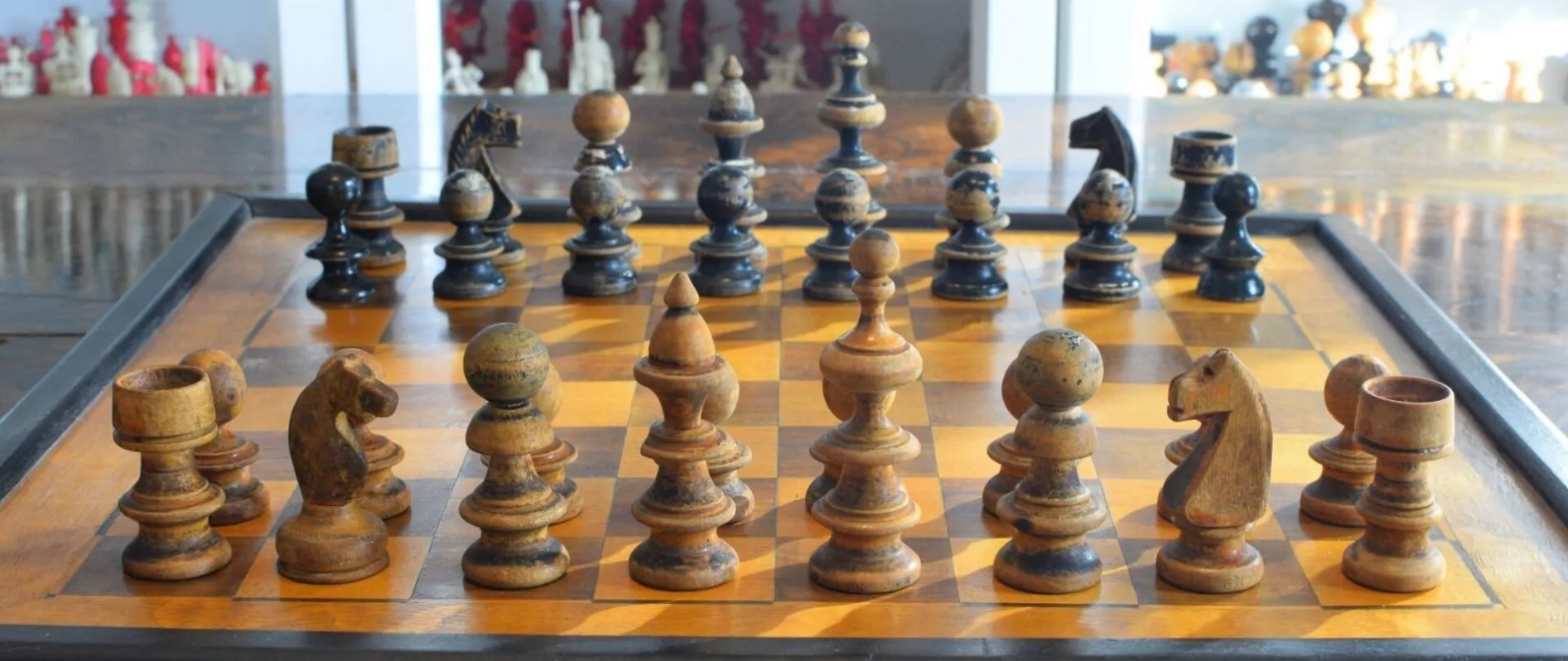 Until WWI, some parts of today’s Romania – namely the region known as Transylvania – belonged to the Austro-Hungarian Empire ruled by the Habsburg dynasty. It can be assumed that through this connection the Austrian coffee house culture and the common chess sets of the so called Vienna Coffee House style also found their way to the southern Kingdom of Romania, where this set was used in the early years of the 20th century. The set is made of turned wood, one side natural, the other coated in black lacquer. It shows some design features common with the aforementioned Vienna sets, in particular the queens’ crowns, which are shaped like hats, the bishops with ball shaped heads in opposite colour or the sturdy rooks. What is interesting in particular is the unusual shape of the king, the crown of which on the upper side narrows into an elongated finial topped with a small ball, almost as if a small pawn sits on top of the kings crown. The set shows some signs of intensive use. Some of the pieces seem to have been replaced, but this does not detract from the overall impression. Image and text taken from Langer collection.