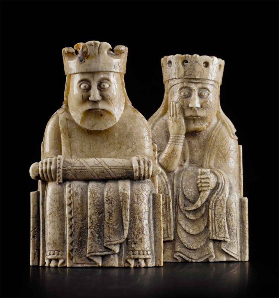 The Lewis Chessmen Found on Scotland’s Isle of Lewis and carved from walrus ivory, these 12th-century figures mark the spectacular transition of chess from abstract shapes to vivid storytelling. Shaped by Norse craftsmanship, these pieces—with their anxious kings, contemplative queens, and shield-biting berserkers—reflect the social hierarchy and psyche of Medieval Europe. As the geometric pieces of the East reached the North, they were transformed into these dramatic, humanized characters, laying the visual foundation for modern chess.