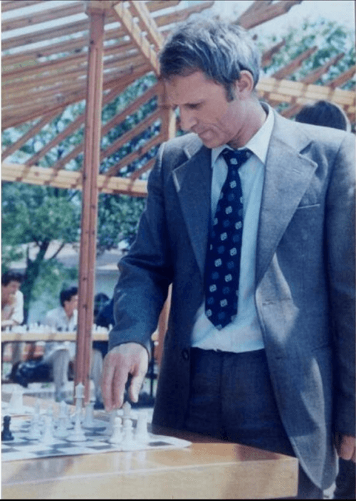 A frequent visitor at the Istanbul Chess Association, FIDE Arbiter and immigrant from Bulgaria, İsmet Arvit, making a move with Gambit model chess pieces during a simultaneous exhibition in Istanbul.