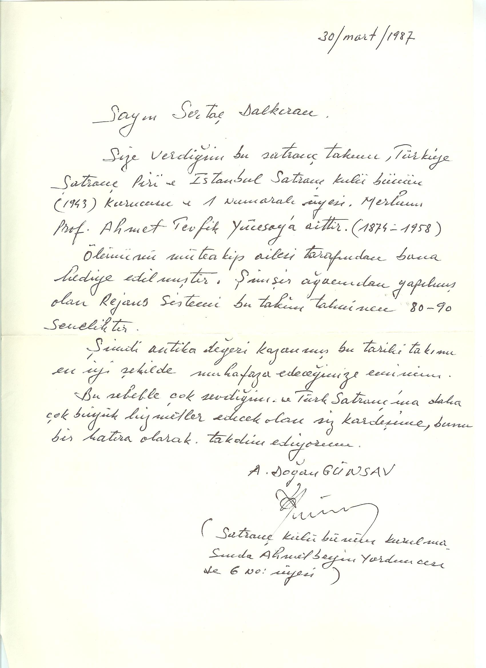 A. Doğan Günsav'ın Sertaç Dalkıran'a yazdığı mektuba eşlik eden satranç takımının fotoğrafını aşağıda bulabilirsiniz. Günsav, satranç takımının Yücesoy'un vefatından sonra ailesi tarafından kendisine hediye edildiğini paylaşıyor.